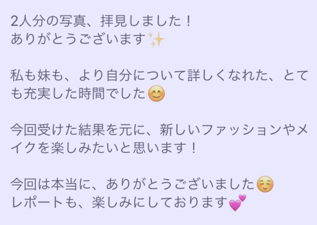 ペア診断 2025年12月4日 WRITER yu この記事を書いている人 - WRITER - yu 先日のペア診断のお客様は高校生と20歳の仲良し姉妹💖 お二人仲良くブルベ同士でした✨ 妹♡◉カラー ウィンター(ブルベ冬)ベストカラー:ミステリアスブラック◉骨格 ナチュラル※ウエーブ寄り 姉♡◉カラー サマー(ブルベ夏)ベストカラー:ラベンダーブルー◉骨格 ウエーブ※ごくストレートに近い それぞれの似合う✨が見つかりました😊 ありがとうございましたレポートお待たせいたしました🍀🍀🍀 LINEでのお問い合わせも受け付けております。 下のLINEアイコンをタップして、お気軽にメッセージくださいね。 この記事を書いている人 - WRITER - yu 前の記事 -Prev- 締め切り間近♡クリスマス婚活in南相馬 関連記事 - Related Posts - ウィンター・ナチュラル ウィンター・ナチュラル ウィンター・ストレート サマー・ナチュラル 最新記事 - New Posts - ご予約可能日(随時更新中)年内12/28(日)1名様! ペア診断 締め切り間近♡クリスマス婚活in南相馬 スプリング・ストレート